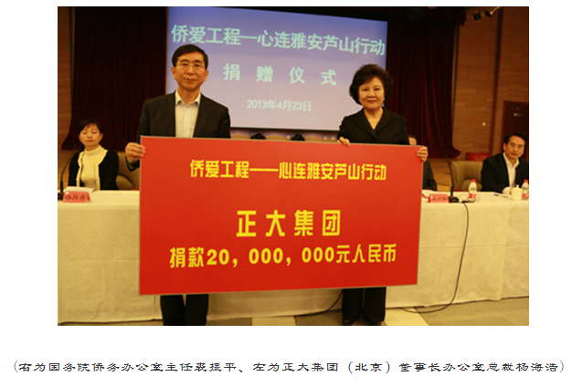 2013年4月20日8時02分,四川省雅安市蘆山縣發(fā)生7.0級地震。消息傳來,舉國震動。中國人民心連心,一方有難八方支援,全國人民與雅安人民站在一起。社會各界紛紛伸出了援助之手,對災(zāi)區(qū)進行了各種形式的捐助、支持與幫助。4月23日,正大集團為雅安地震災(zāi)區(qū)捐款人民幣2000萬元,集團(北京)董事長辦公室楊海浩總裁代表集團出席國務(wù)院僑辦舉行的“僑愛工程——心連雅安蘆山”行動捐贈儀式。 正大集團是泰籍華人創(chuàng)辦的跨國公司,自一九七九年進入中國,在中國的投資遍及除青海、西藏以外的所有省、市、自治區(qū),員工人數(shù)超過8萬人,年銷售額超過500億人民幣,形成了以農(nóng)牧業(yè)、食品業(yè)、商業(yè)零售業(yè)為核心,制藥、機車、房地產(chǎn)、國際貿(mào)易、金融、傳媒等領(lǐng)域共同發(fā)展的業(yè)務(wù)格局。 正大集團董事長、中國僑商投資協(xié)會會長謝國民先生是著名的愛國僑商,對中國懷有特殊感情。長期以來,熱心家鄉(xiāng)教育、公益事業(yè)、醫(yī)療事業(yè)和扶貧救災(zāi),累計捐資超過3億元人民幣。僅2012年全年捐資近2000萬元人民幣。 謝國民集團董事長在雅安地震發(fā)生之后,心系災(zāi)區(qū)人民,密切關(guān)注災(zāi)情,第一時間為雅安地震災(zāi)區(qū)捐款2000萬元人民幣。正大集團愿與全國人民一道支援災(zāi)區(qū)人民奪取抗震救災(zāi)的全面勝利!